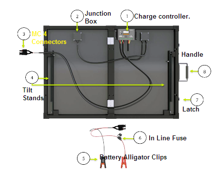 From this side, it is possible to see the charge controller, junction box and MC4 connectors. Also, the tilt stands, battery alligator clips, in line fuse, latch and handle.